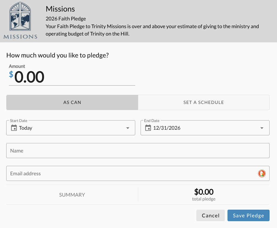Your faith pledge to Trinity Missions is over and above your estimate of giving to the ministry and operating budget of Trinity on the Hill. All Missions faith pledges go directly to Trinity on the Hill mission partners in order to make Christ known locally and globally. Your faith pledge allows our Missions Leadership team to develop a budget for funding our mission partners from January 2026 – December 2026. Your pledge can be revised or canceled at any time at your request. We invite you to prayerfully consider how the Lord is asking you to respond with your financial support.